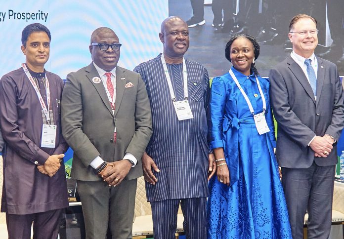L-R: Chairman/Managing Director, ExxonMobil Affiliates in Nigeria, Jagir Baxi; Chairman, Independent Petroleum Producers Group/Managing Director, Aradel Holdings Plc, Adegbite Falade; Honourable Minister of State, Ministry of Petroleum Resources (Oil), Senator Heineken Lokpobiri; Commission Chief Executive, Nigerian Upstream Petroleum Regulatory Commission, Oritsemeyiwa Eyesan and Chairman/Managing Director, Chevron Nigeria, Jim Swartz during a panel session at the Nigeria International Energy Summit 2026 at the Abuja International Conference Centre, Abuja.