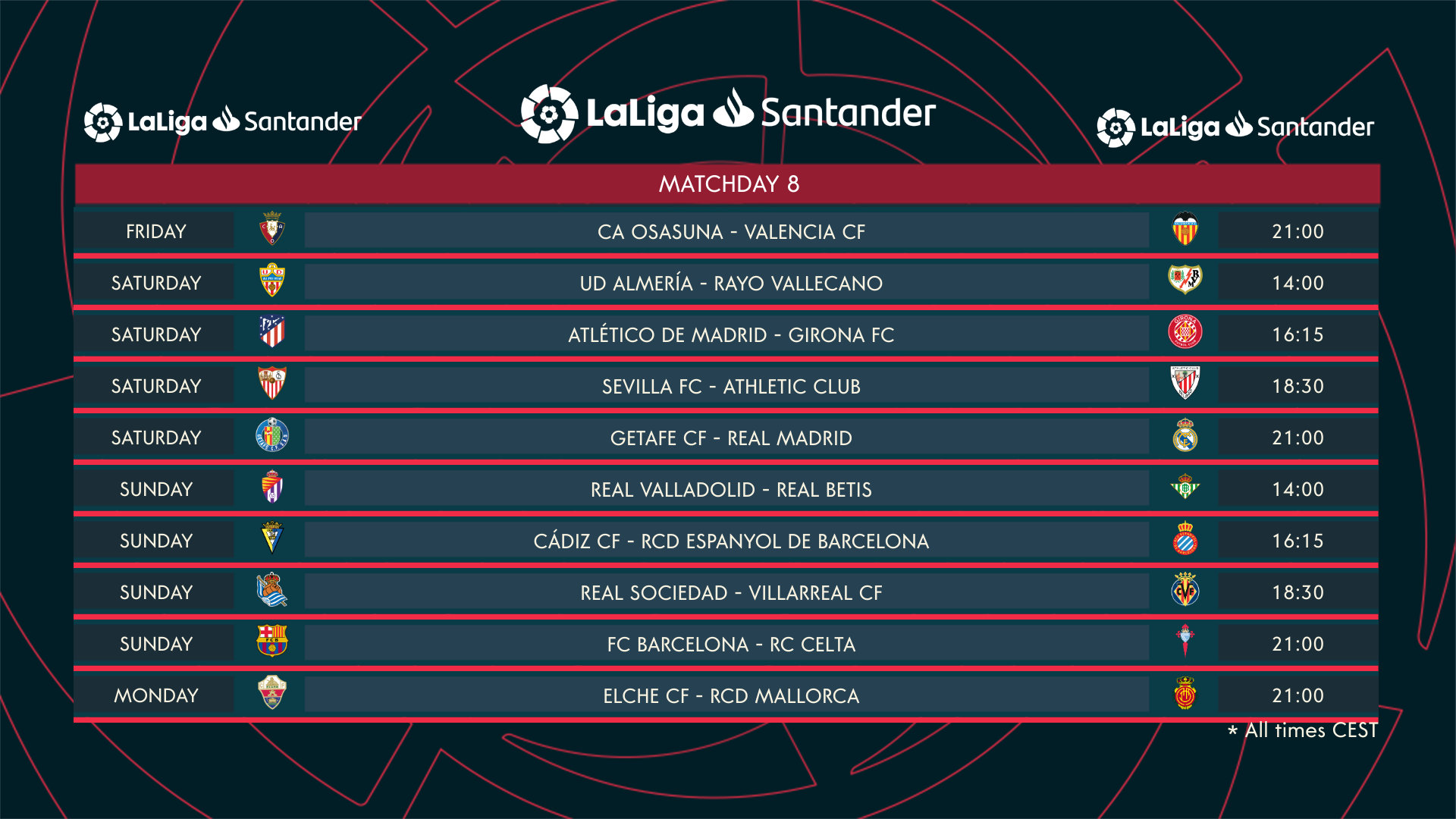 Matchday 8 of LaLiga Santander comes at a crucial stage of the season, as league leaders FC Barcelona and Real Madrid, who are tied on 19 points, search for momentum ahead of their ElClasico showdown on October 16th. This weekend, the Catalan outfit host a dangerous RC Celta side, while Real Madrid make the short trip to Getafe CF’s Coliseum Alfonso Pérez, a stadium where Carlo Ancelotti’s side lost last season.