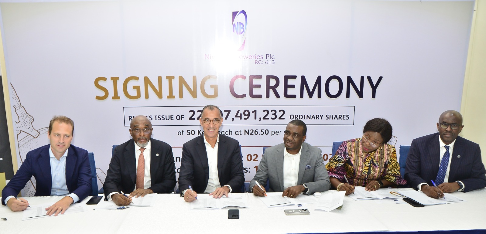 L-R: Finance Director, Nigerian Breweries Plc, Ben Wessels Boer; Group Managing Director/Chief Executive Officer, Vetiva (Lead Issuing House), Chuka Eseka; Managing Director, NB Plc, Hans Essaadi; Company Secretary/Legal Director, NB Plc, Uaboi Agbebaku; Independent Non-Executive Director, NB Plc, Adeyinka Aroyewun, and Chief Executive, Stanbic IBTC Capital Limited, Oladele Sotubo during the signing ceremony of Nigerian Breweries Plc's ₦599.1 billion Rights Issue held at the company’s headquarters in Lagos