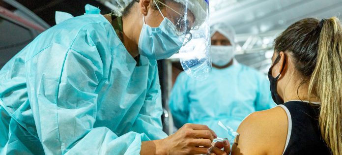 © UNICEF/PAHO/Karina ZambranaA Brazilian health worker receives a COVID-19 vaccination.